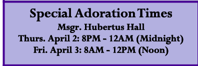 April 4, 2026(4 events) 40 Cans for LentFebruary 19, 2026 – April 4, 2026 Church Scholarship application for SeniorsApril 4, 2026 6:30 am: Men's 12 Apostles (Holy Hour) Church 8:30 pm: Easter Vigil Mass Church |