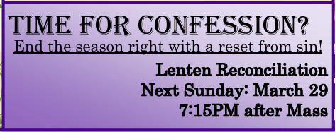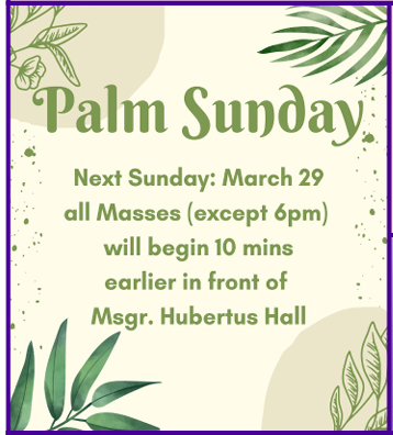 March 29, 2026(5 events) 40 Cans for LentFebruary 19, 2026 – April 4, 2026 Church Palm SundayMarch 29, 2026 Hubertus Hall Scholarship application for SeniorsMarch 29, 2026 4:00 pm: Youth Group Hubertus Hall 7:15 pm: Lenten Reconciliation Church |