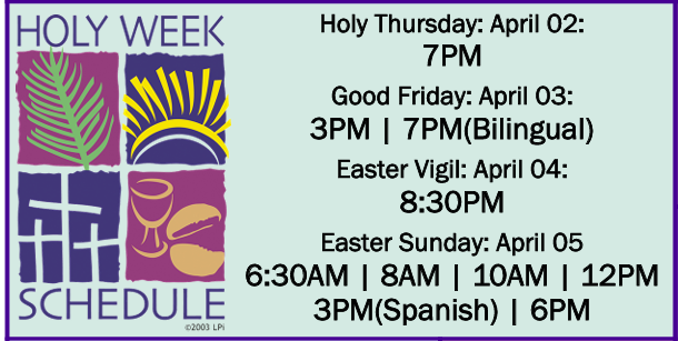 April 2, 2026(5 events) 40 Cans for LentFebruary 19, 2026 – April 4, 2026 Church Scholarship application for SeniorsApril 2, 2026 7:00 pm: Holy Thursday Mass Church 7:00 pm: Rehearsal for Sunday 10 a.m. Mass Choir Church 8:00 pm: Adoration Church |