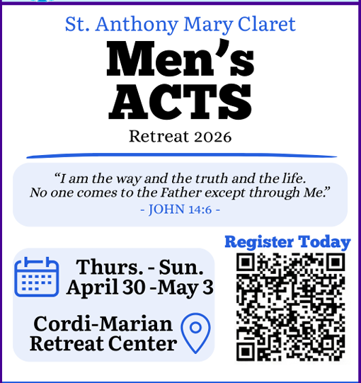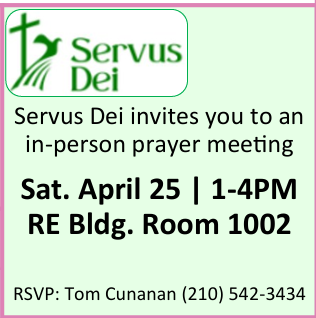 April 25, 2026(4 events) 6:30 am: Men's 12 Apostles (Holy Hour) Church 8:30 am: 3rd Year Confirmation Retreat (Girls) Hubertus Hall 1:00 pm: Servus Dei prayer meeting Building B (Religious Education Building) |