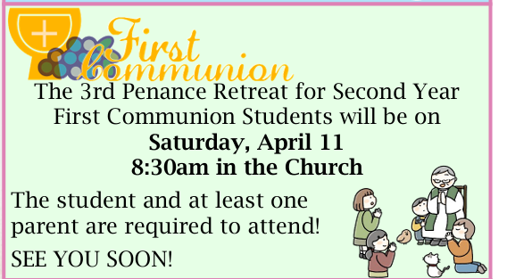 April 11, 2026(3 events) Scholarship application for SeniorsApril 11, 2026 6:30 am: Men's 12 Apostles (Holy Hour) Church 8:30 am: 2nd Year First Communion 3rd Penance Retreat Church |