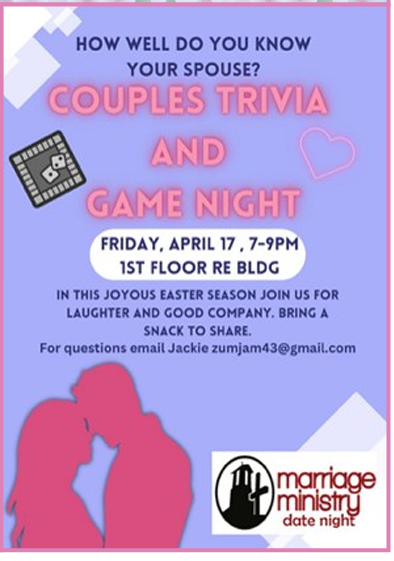 April 17, 2026(2 events) Scholarship application for SeniorsApril 17, 2026 7:00 pm: Couples Trivia and Game Night with Marriage Ministry Building B (Religious Education Building) |